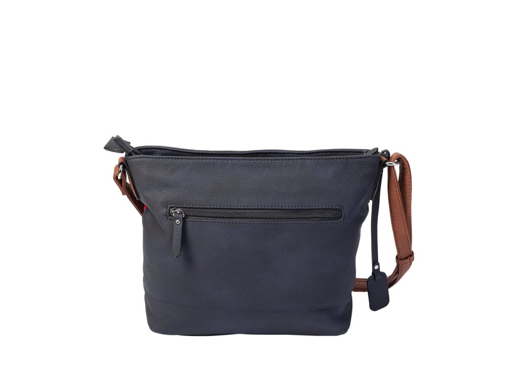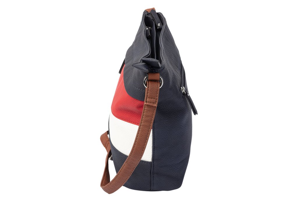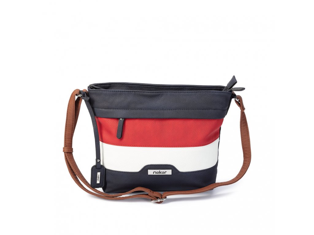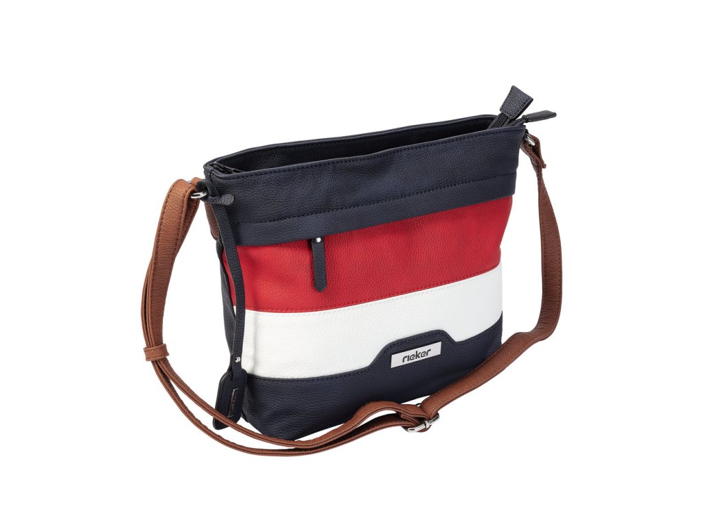 Krásná tříbarevná dámská kabelka značky RIEKER. Má hladký povrch a je na přední straně zdobena nápisem RIEKER, který ji zdobí i na modrém odepínacím pásku na boční straně. V horní části přední strany se nachází skrytý funkční zip. Má dvě velké kapsy na zip, kterými se do kabelky dostanete. V jedné najdete dvě otevřené přihrádky na telefon a ve druhé je kapsička na zip, kam si můžete uložit všechny drobnosti. Na zadní straně je také všita funkční kapsa na zip. Tento model má dlouhý hnědý nastavitelný popruh. Díky spoustě úložného prostoru jej využijete jak do práce, tak na vycházku do města.