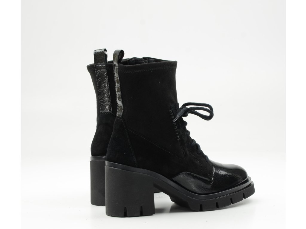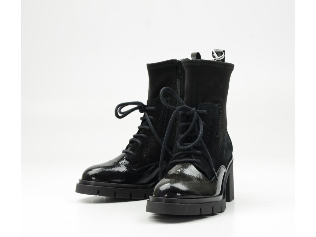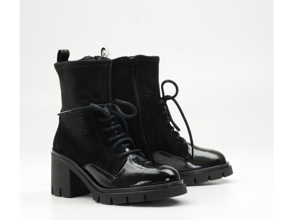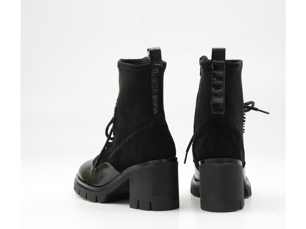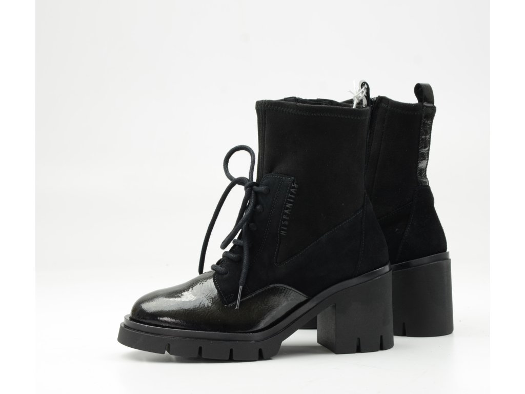 Dámské kotníkové boty Hispanitas 254281 ANTRACITA v černém provedení spojují moderní design a maximální komfort. Obuv je vyrobena z kombinace broušené a lakované kůže, což dodává botám originální kontrastní vzhled. Masivní blokový podpatek a výrazná podešev přinášejí stabilitu i trendový charakter.