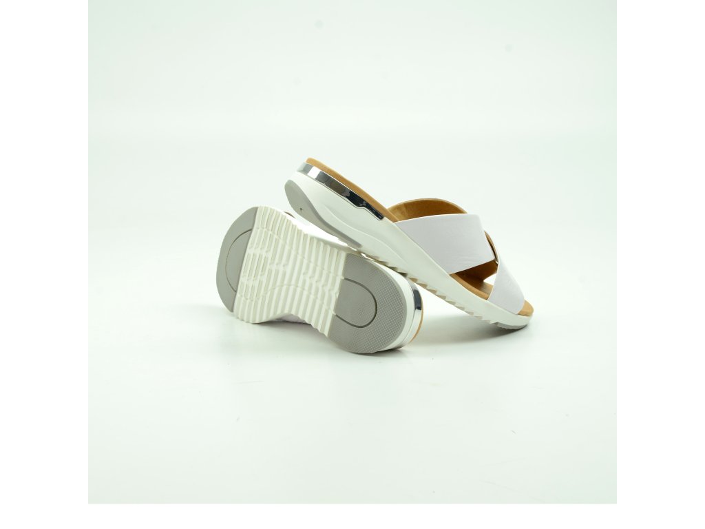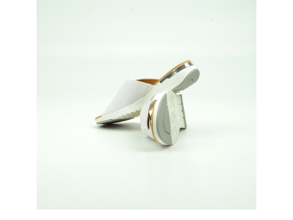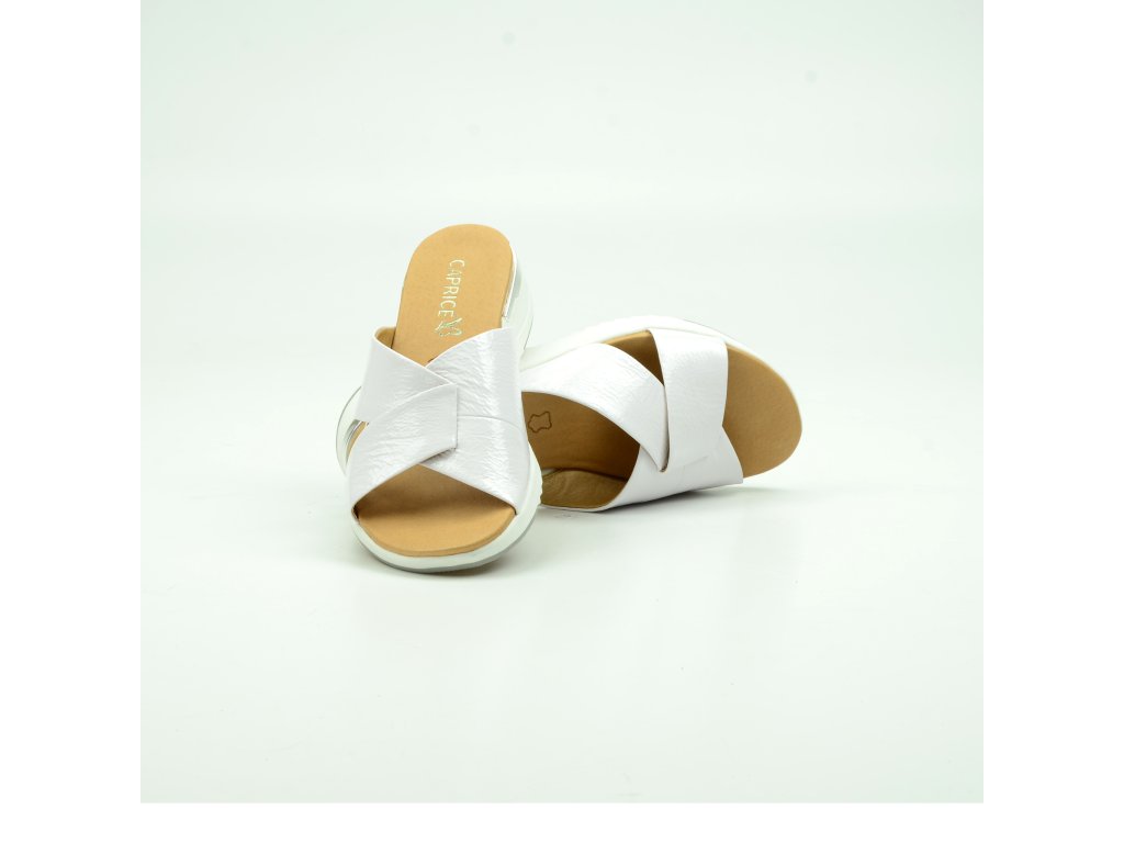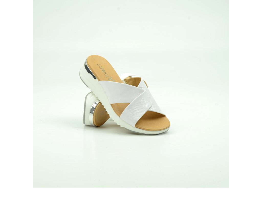 Dámské pantofle Caprice 9-9-27200-26-122 white. Jednoduše elegantní nazouváky, značky CAPRICE budou tou správnou volbou. Široké pásky jsou v oblasti nártu zajímavě překříženy a jsou vyrobeny z pravé lesklé kůže. Pro lepší přizpůsobení obuvi je na vnitřní straně pásku všita pružná gumička. Pohodlí na každém kroku Vám zajistí měkká kožená stélka.
