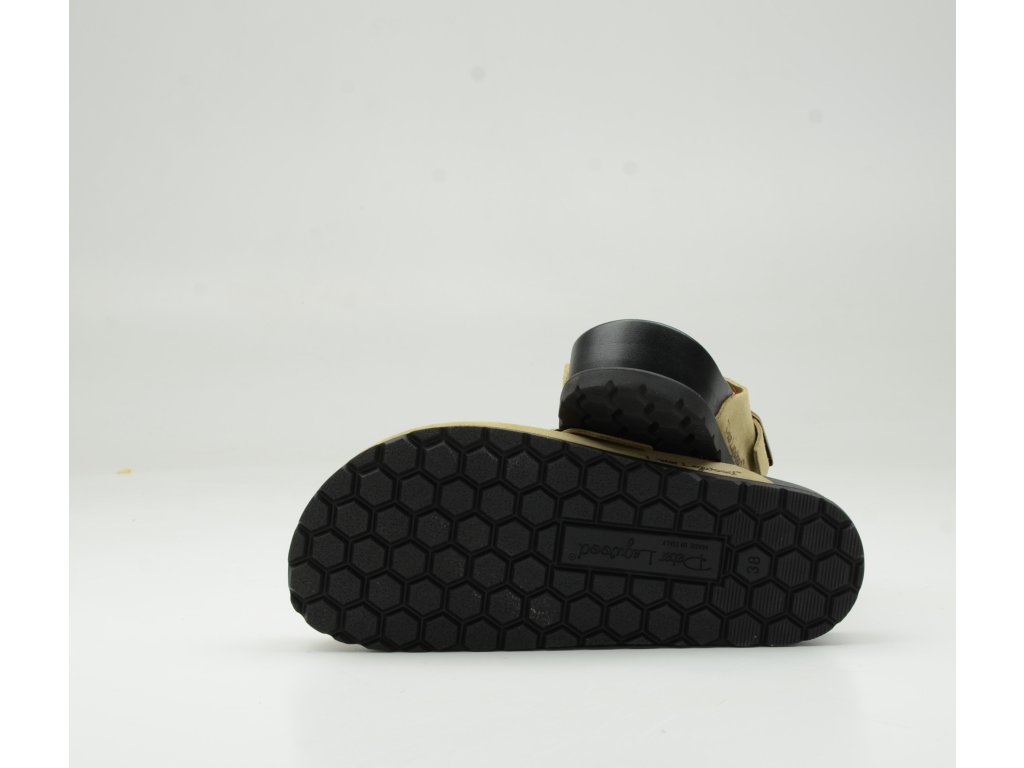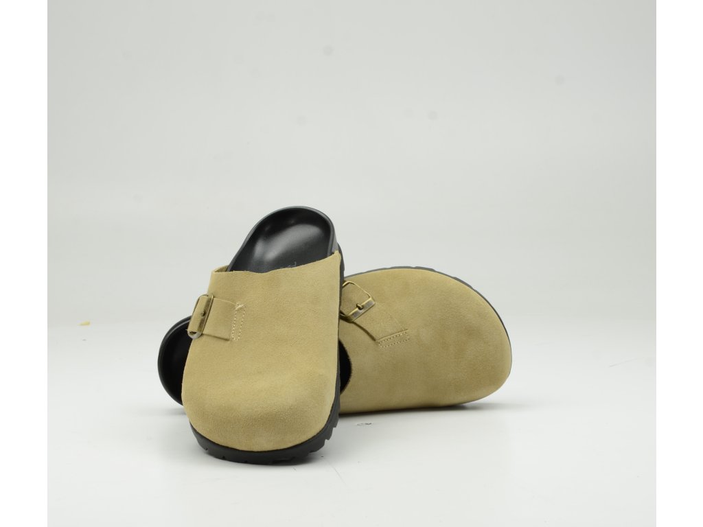 Měkký svršek v semišovém vzhledu se příjemně přizpůsobí noze a nastavitelný pásek s kovovou přezkou umožňuje individuální dotažení. Anatomicky tvarovaná stélka podporuje správné postavení chodidla a zajišťuje pohodlí i při celodenním nošení – doma, v práci nebo při běžném pohybu.