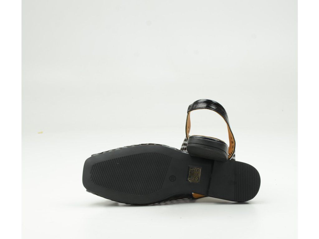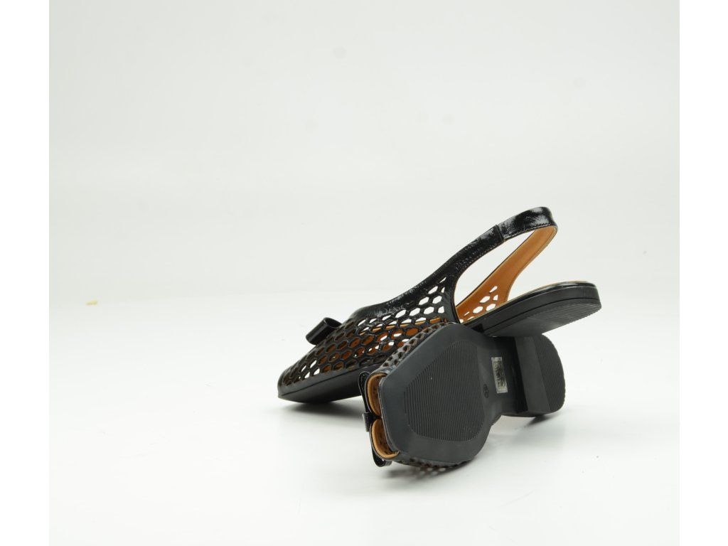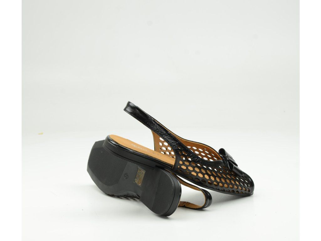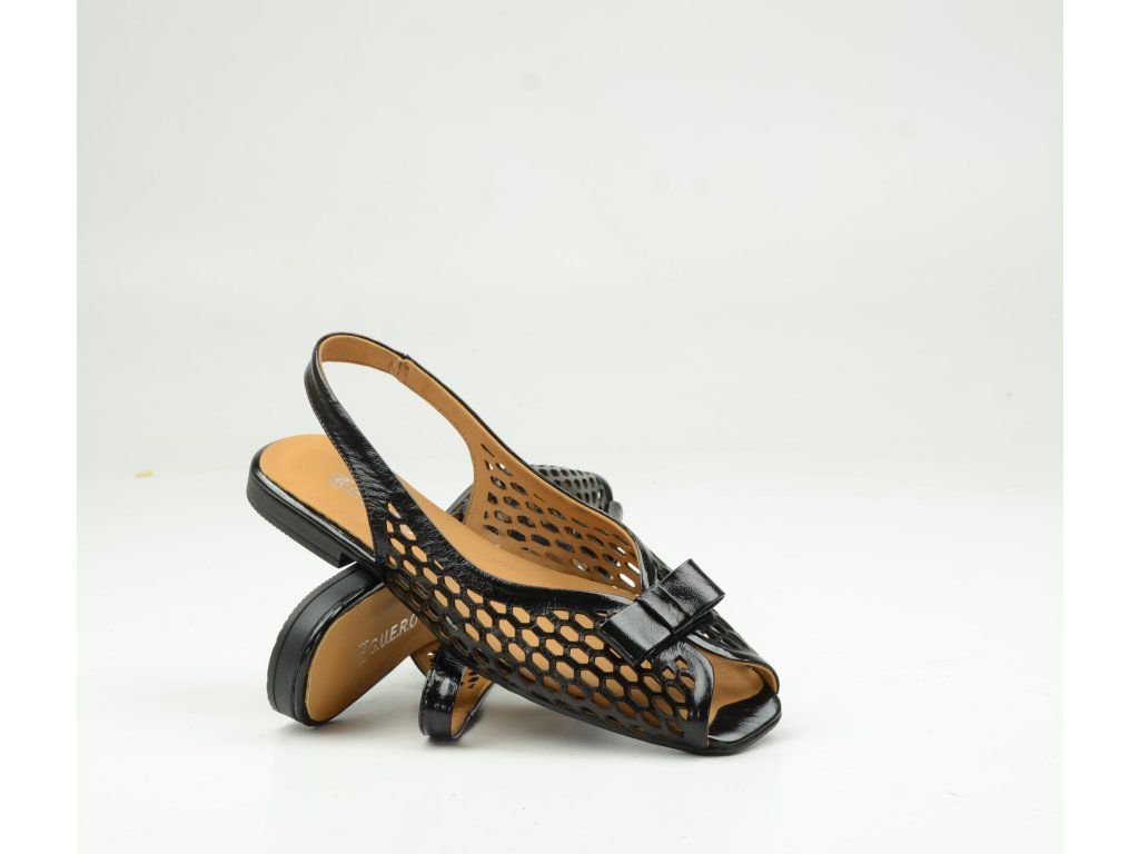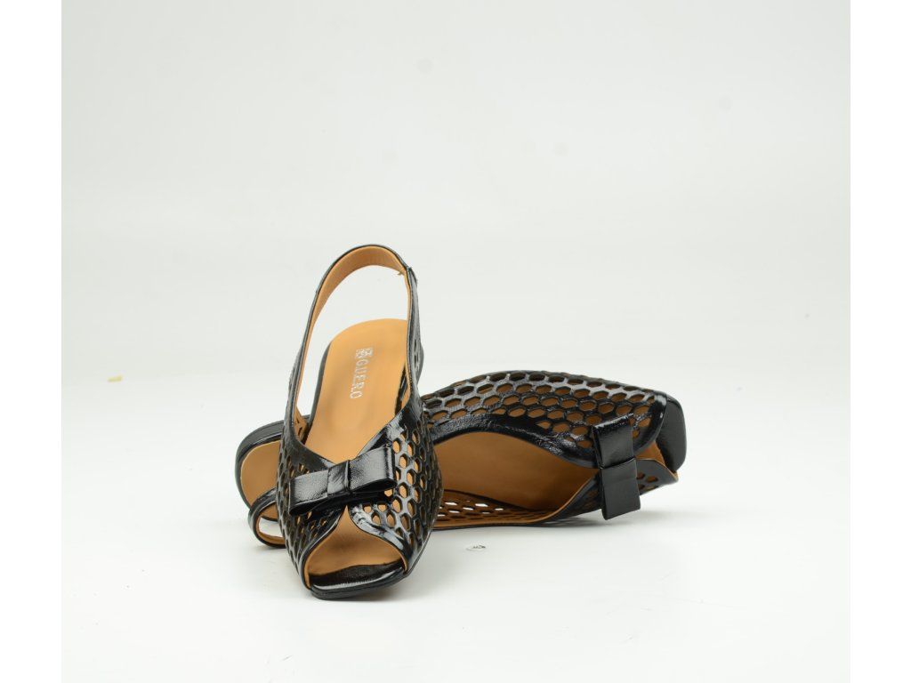 Svršek působí velmi elegantně díky lesklému efektu a jemné mašličce na špičce, která dodává botám ženský a sofistikovaný nádech. Otevřená konstrukce spolu s perforací zajišťuje příjemné klima pro chodidlo i při celodenním nošení.