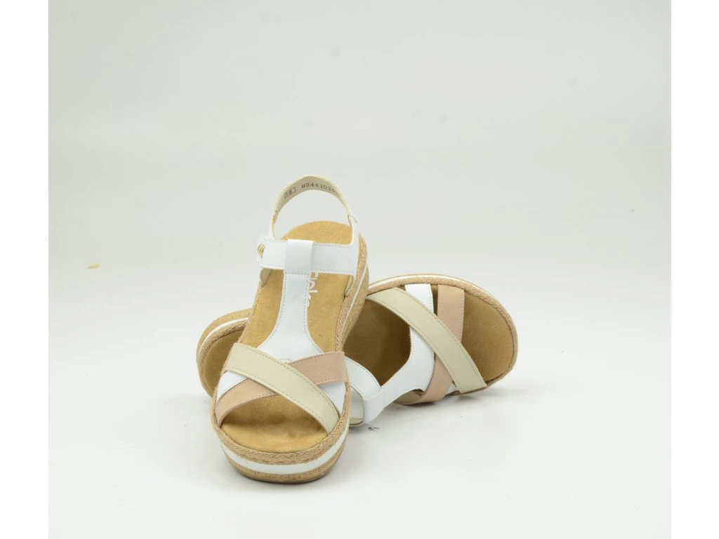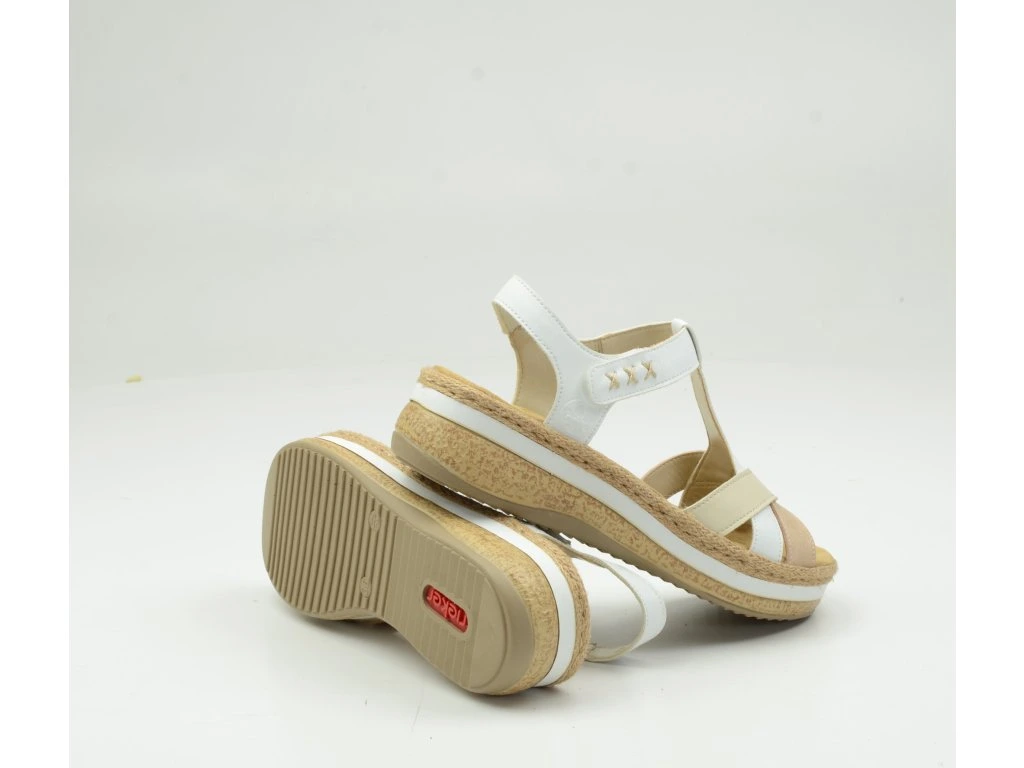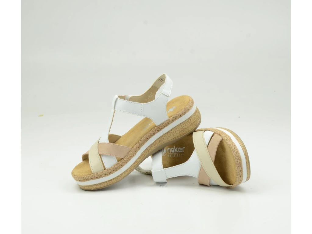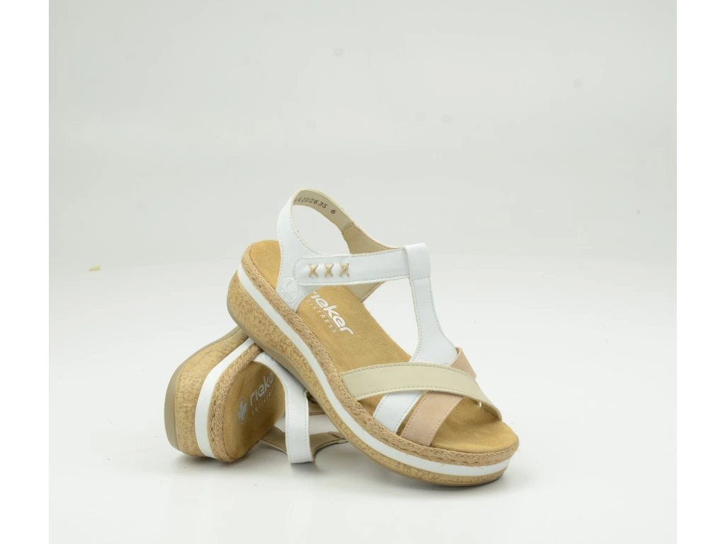 Dámské sandály Rieker V0919-80 zaujmou svým svěžím letním vzhledem v kombinaci bílé, béžové a přírodních tónů. Elegantní křížové pásky spolu s jemnými detaily dodávají botám moderní a nadčasový styl, který snadno sladíte s každodenním outfitem i dovolenkovým lookem.
