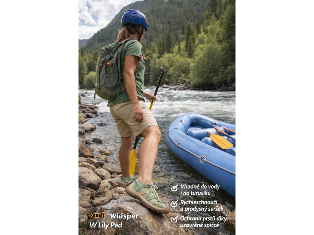 Dámské sandály KEEN Whisper W Lily Pad jsou perfektní volbou pro aktivní ženy, které hledají maximální pohodlí, stabilitu a odolnost v letních dnech. Díky uzavřené špičce chrání prsty a zároveň umožňují přirozený pohyb při chůzi v terénu i ve vodě.