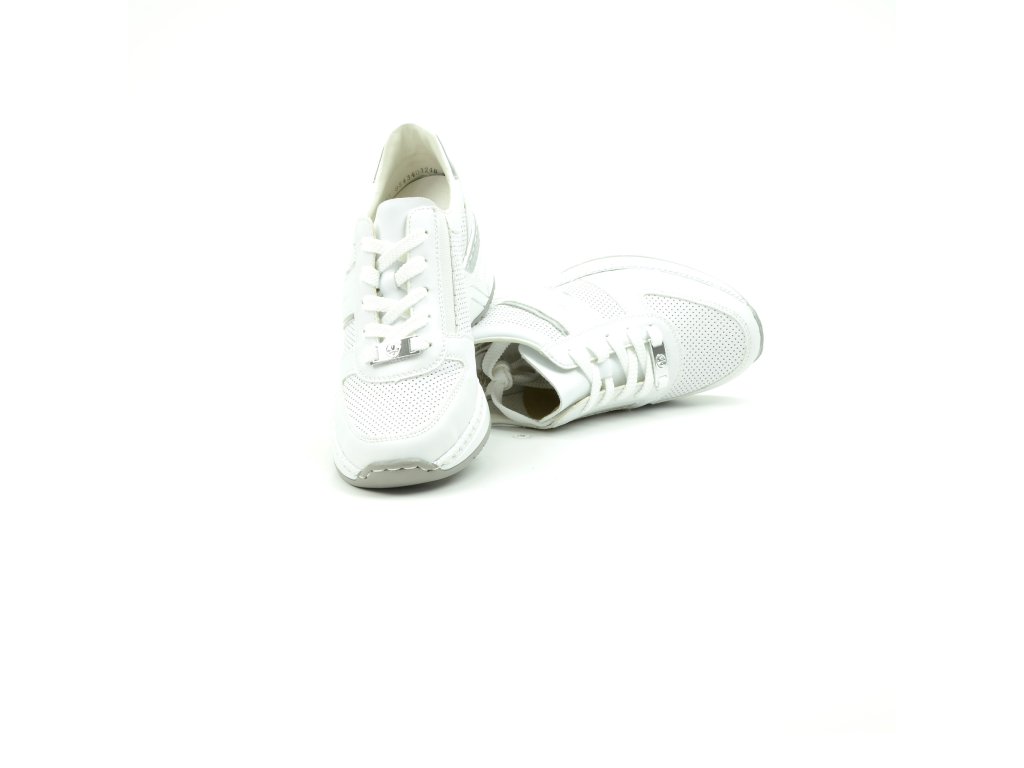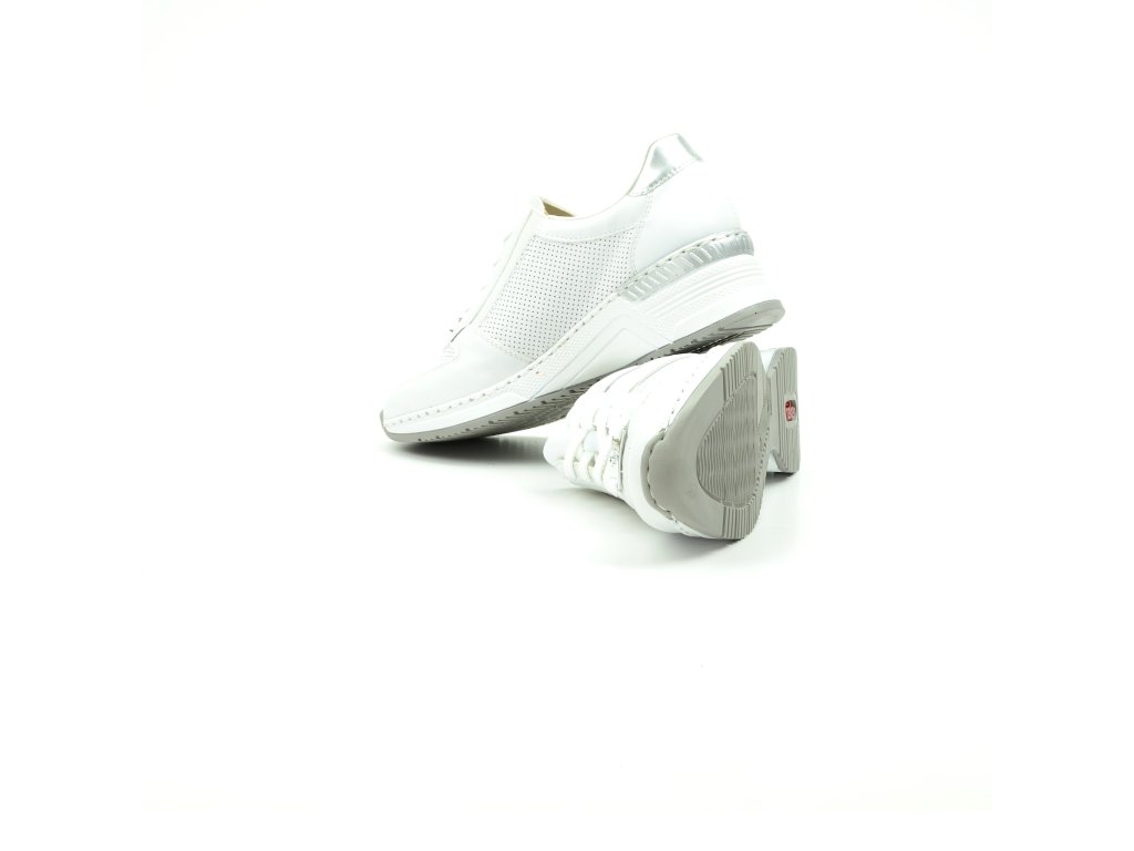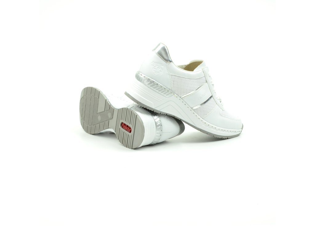 Trendové a pohodlné dámské tenisky na klínku od značky Rieker. Sportovnější střih, obuv je pohodlná a příjemná na noze. Vyrobeno ze strukturované syntetiky plus metalické doplňky ve stříbrných odstínech. Funkční postranní zip pro snadné obutí, uvnitř syntetická podšívk. Měkká kožená stélka a pohodlná podešev s klínkem. Šitý výrobní způsob (Velmi pohodlný a flexibilní, avšak nezaručuje vodotěsnost obuvi. Odolnost vůči vlhku lze zvýšit vhodnými impregnačními přípravky. Obuv doporučujeme používat především v suchém prostředí)