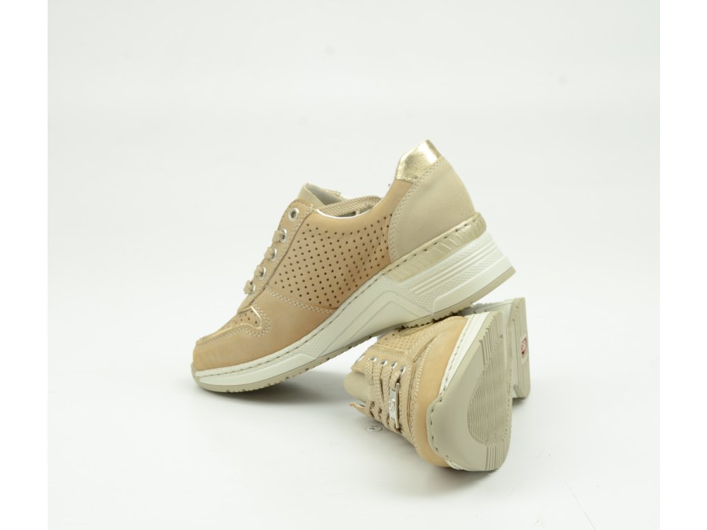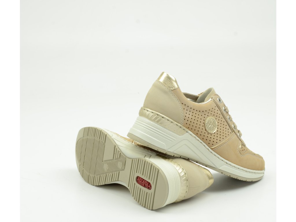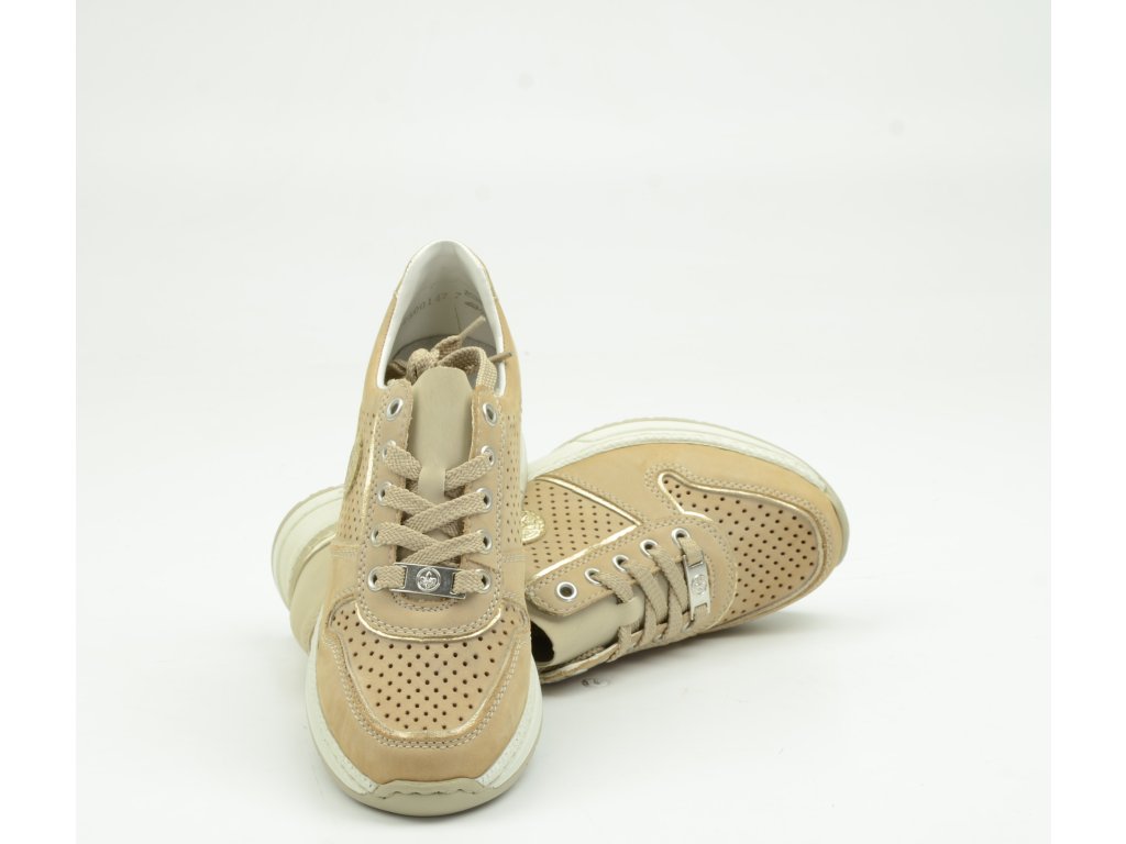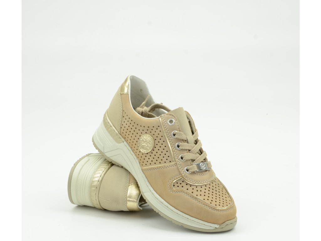 Krásná stylová šněrovací teniska značky RIEKER, ve které se budete cítit vyjímečná. Svrchní materiál se vyznačuje perforací, zajímavým logem a decentní barvičkou. Pro snadné obutí Vám poslouží šněrování, které je dozdobeno lesklými kroužky a krásně doplňuje tenisku. Jistě oceníte pohodlnou stélku, která lze vyměnit nebo vyvětrat podle potřeby. Tento model na vyšší podešvi krásně prodlouží Vaše nohy a docílíte s ním dokonalého outfitu pro každý váš den a ještě se budete cítit pohodlně na každém kroku.