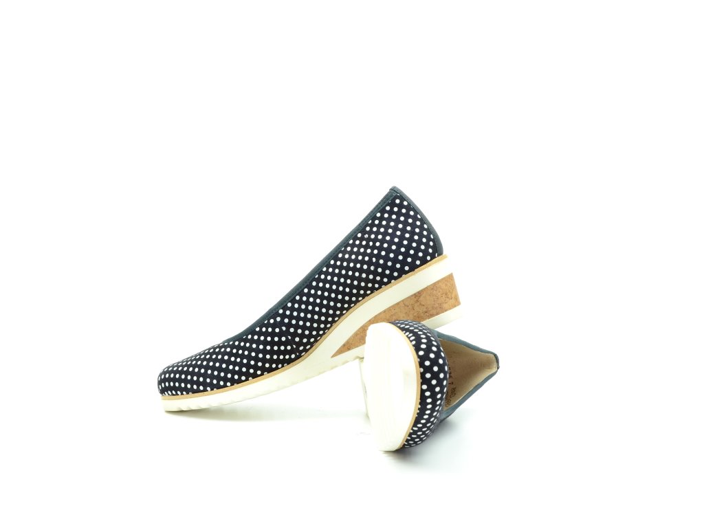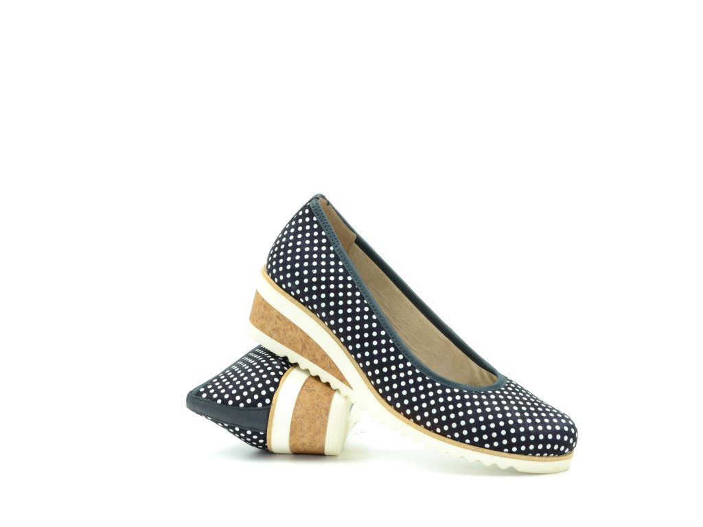 Dámské Remonte baleríny na vyšším klínu. Boty mají tmavěmodrou barvu s puntíkami.