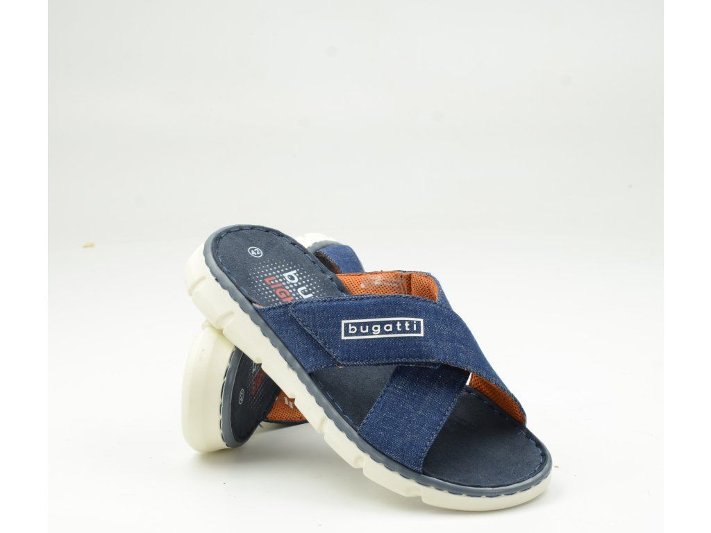 Pánské pantofle Bugatti 321-AK085-6900-4100 v moderním modrém provedení jsou ideální volbou pro teplé letní dny. Minimalistický design s překříženými pásky a decentním logem značky působí sportovně i elegantně zároveň, takže se snadno kombinují s kraťasy i lehkým městským outfitem.