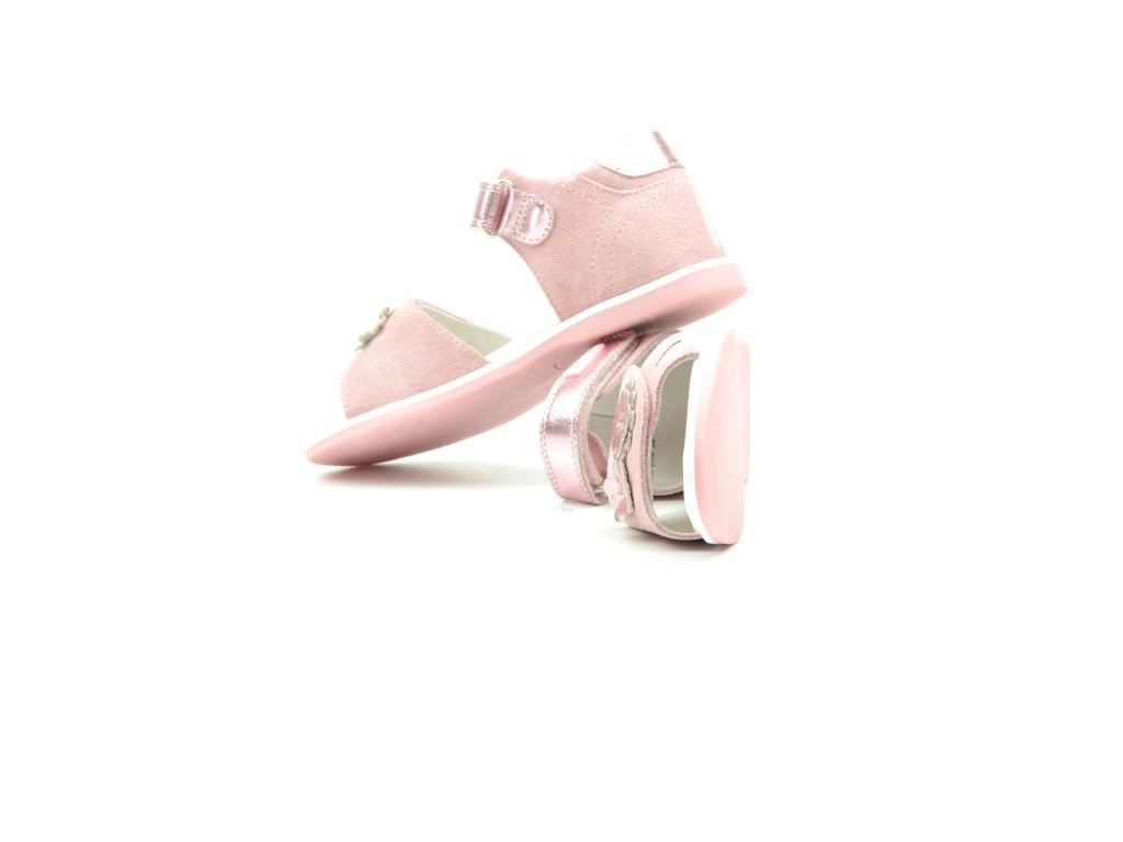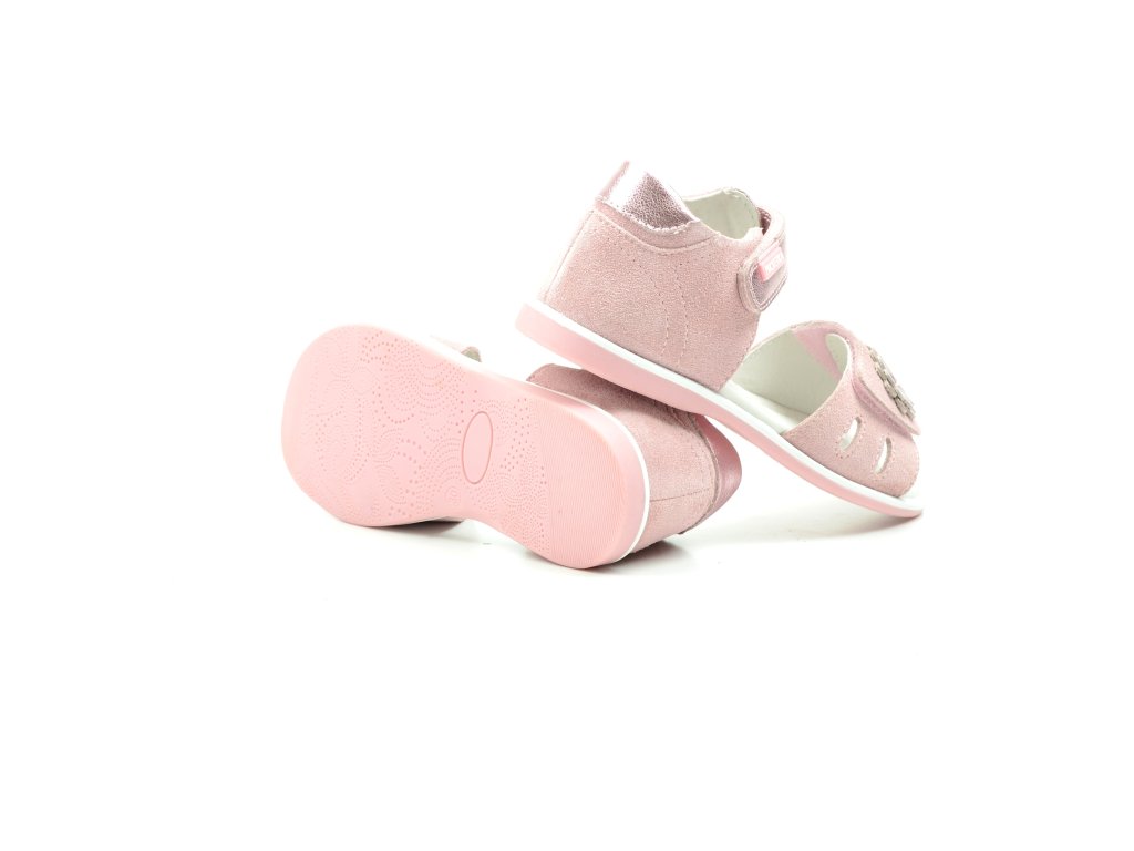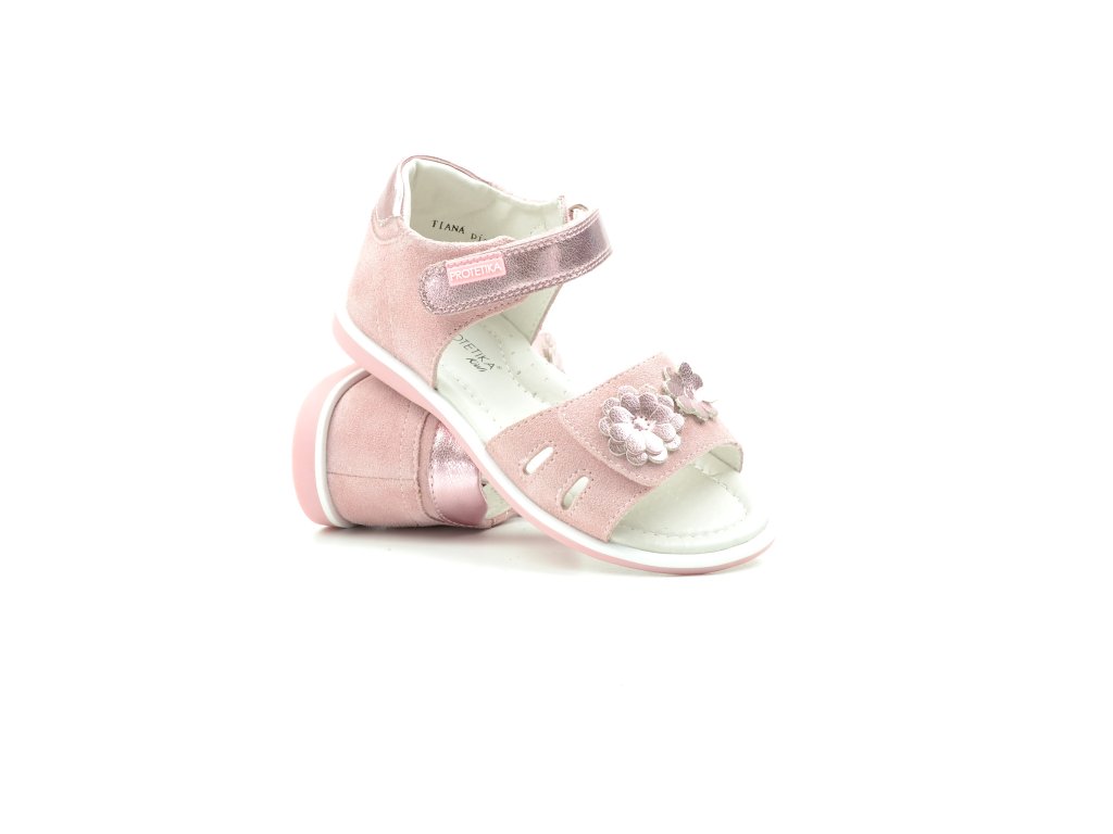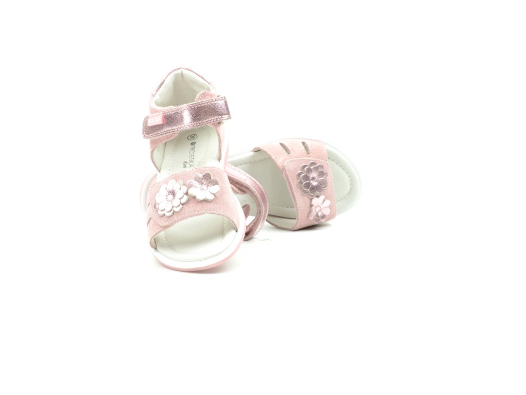 Letní, otevřený sandál s plnou patou. Zapínání na dva suché zipy, uvnitř obuvi kožená stélka s podporou klenby. Svršek obuvi kůže, zpevněný opatek. Sandálky PROTETIKA jsou ortopedické, podporují zdravý růst nožky. Barva růžová s motivem kytiček.