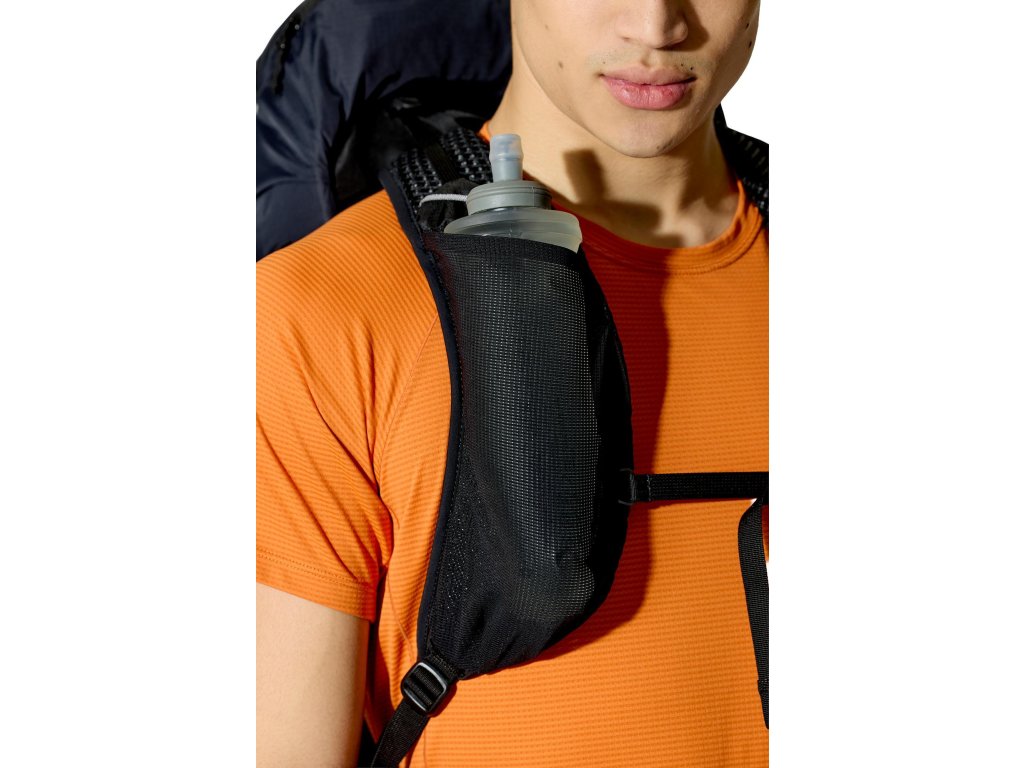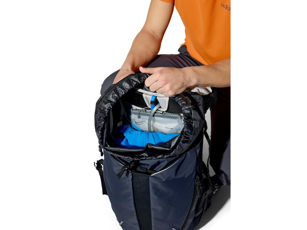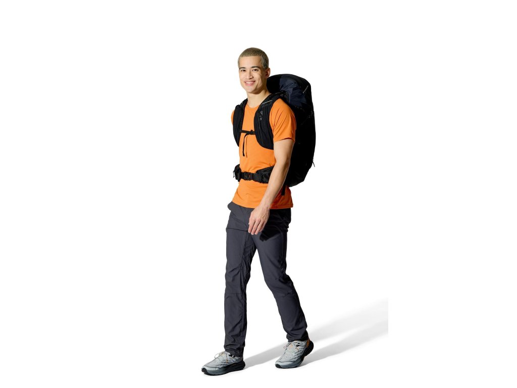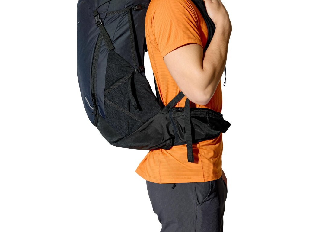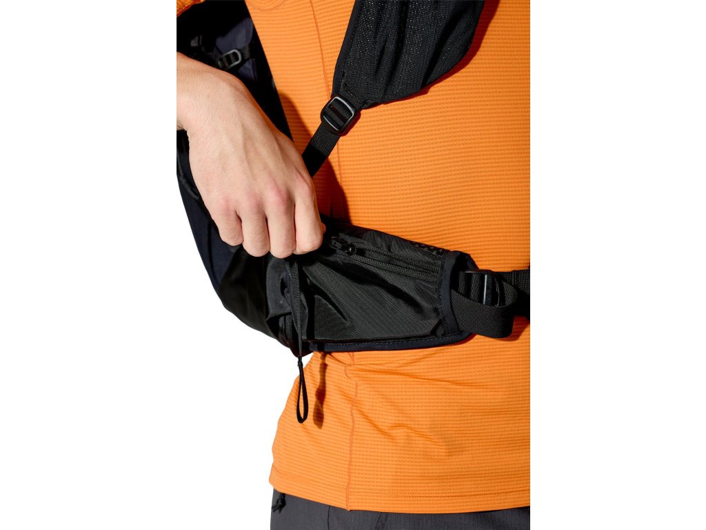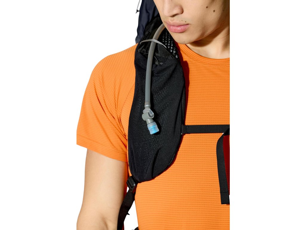 Do hlavní komory jdeš shora – vstup se stahovací šňůrkou a víkem, které má kapsu na zip. Když potřebuješ něco rychle vytáhnout z hlubších věcí, pomůže přední vstup na zip. Vepředu je strečová odkládací kapsa, po stranách 2 síťované kapsy na lahve. Trekové hole připneš do poutek a zajistíš gumou. Na ramenních popruzích máš úložné řešení pro softflask a drobnosti po ruce. Bederní pás s předním dotahem a kapsami na zip drží stabilitu a oporu při pohybu. Uvnitř je kapsa pro 3l hydrovak s vývodem na hadičku, po stranách horní i spodní kompresní popruhy. A když se počasí zlomí, vytáhneš integrovanou pláštěnku.