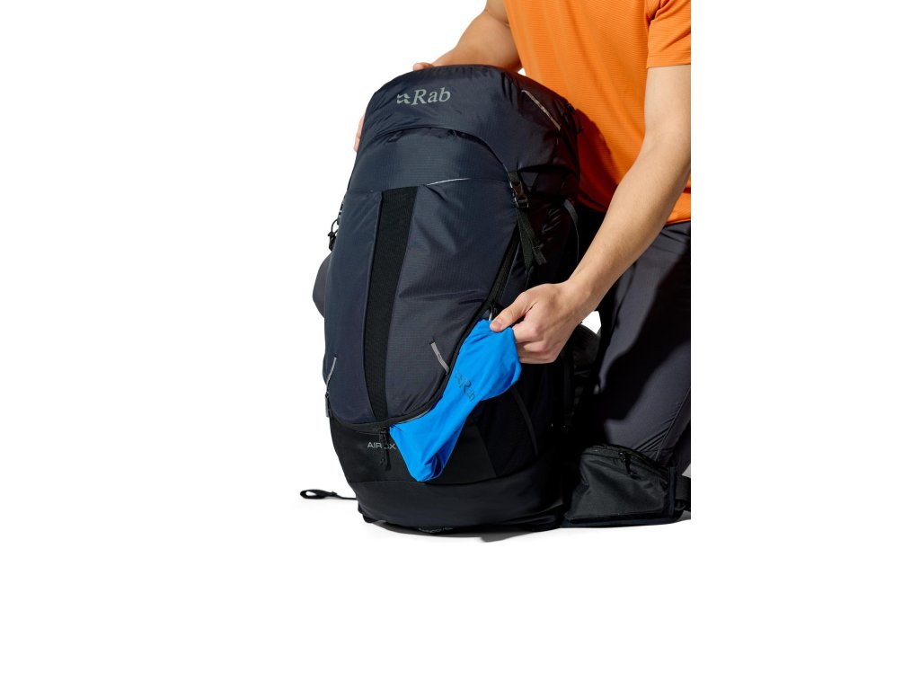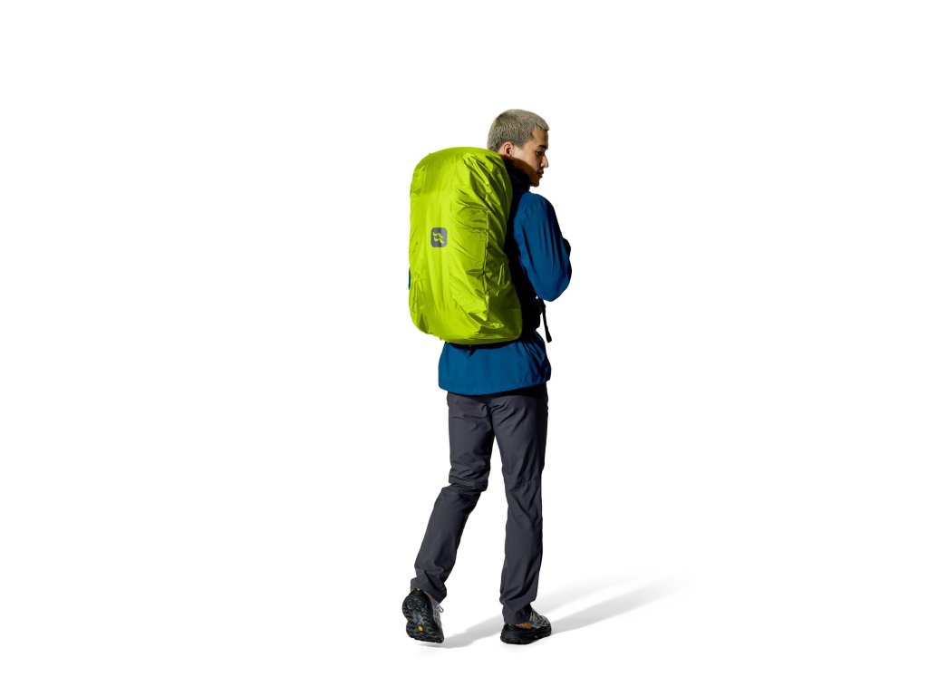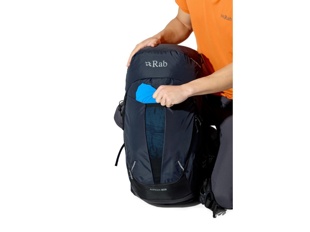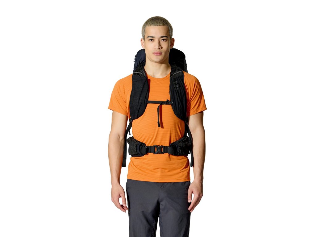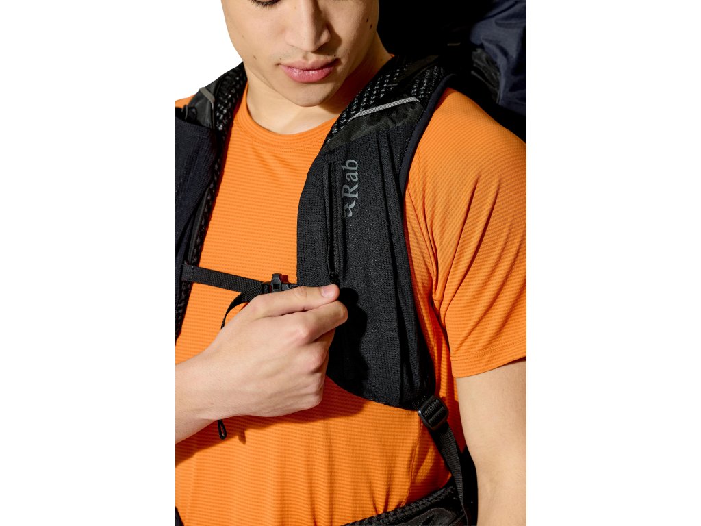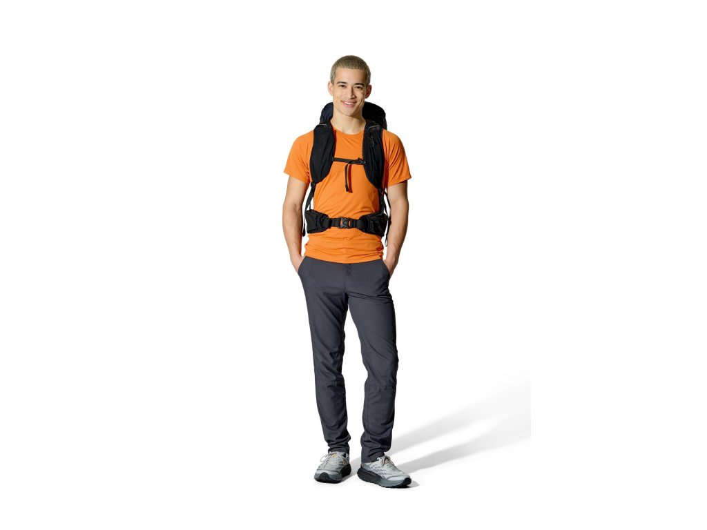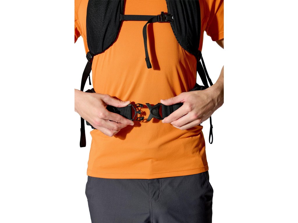 Do hlavní komory jdeš shora – vstup se stahovací šňůrkou a víkem, které má kapsu na zip. Když potřebuješ něco rychle vytáhnout z hlubších věcí, pomůže přední vstup na zip. Vepředu je strečová odkládací kapsa, po stranách 2 síťované kapsy na lahve. Trekové hole připneš do poutek a zajistíš gumou. Na ramenních popruzích máš úložné řešení pro softflask a drobnosti po ruce. Bederní pás s předním dotahem a kapsami na zip drží stabilitu a oporu při pohybu. Uvnitř je kapsa pro 3l hydrovak s vývodem na hadičku, po stranách horní i spodní kompresní popruhy. A když se počasí zlomí, vytáhneš integrovanou pláštěnku.