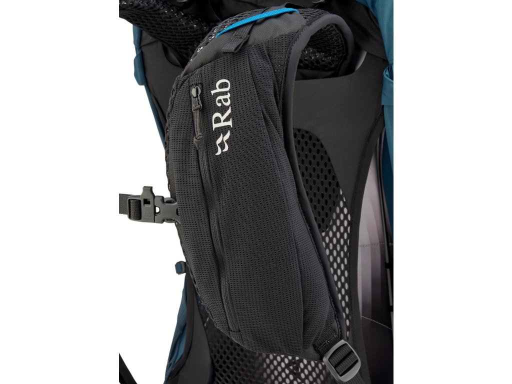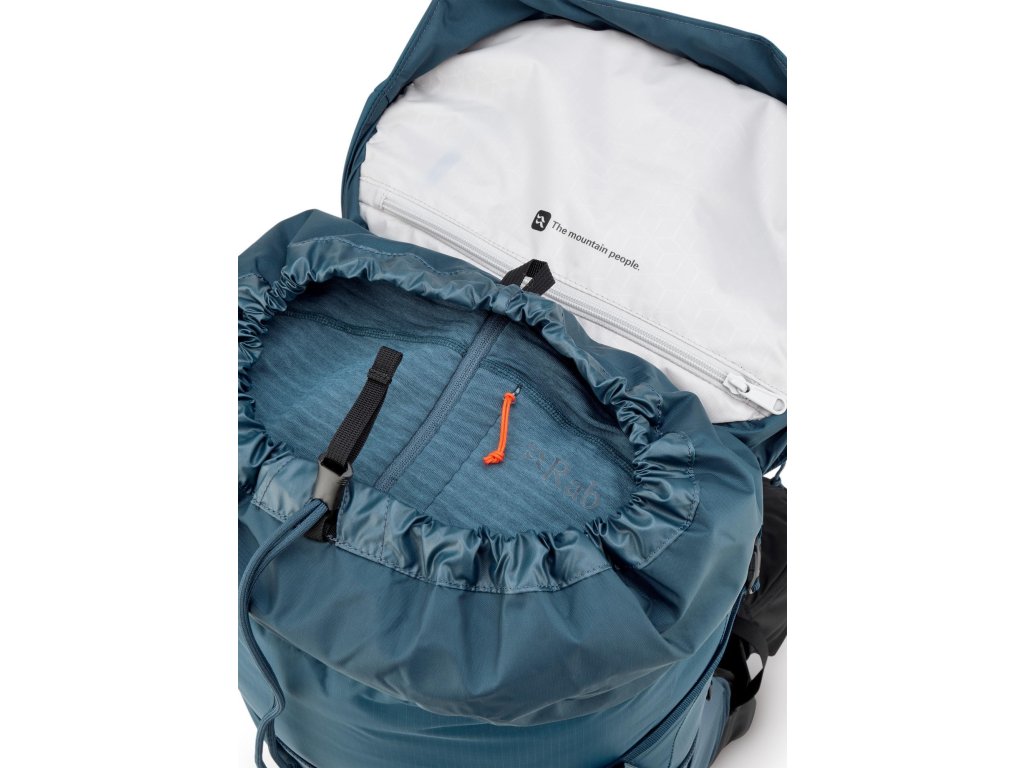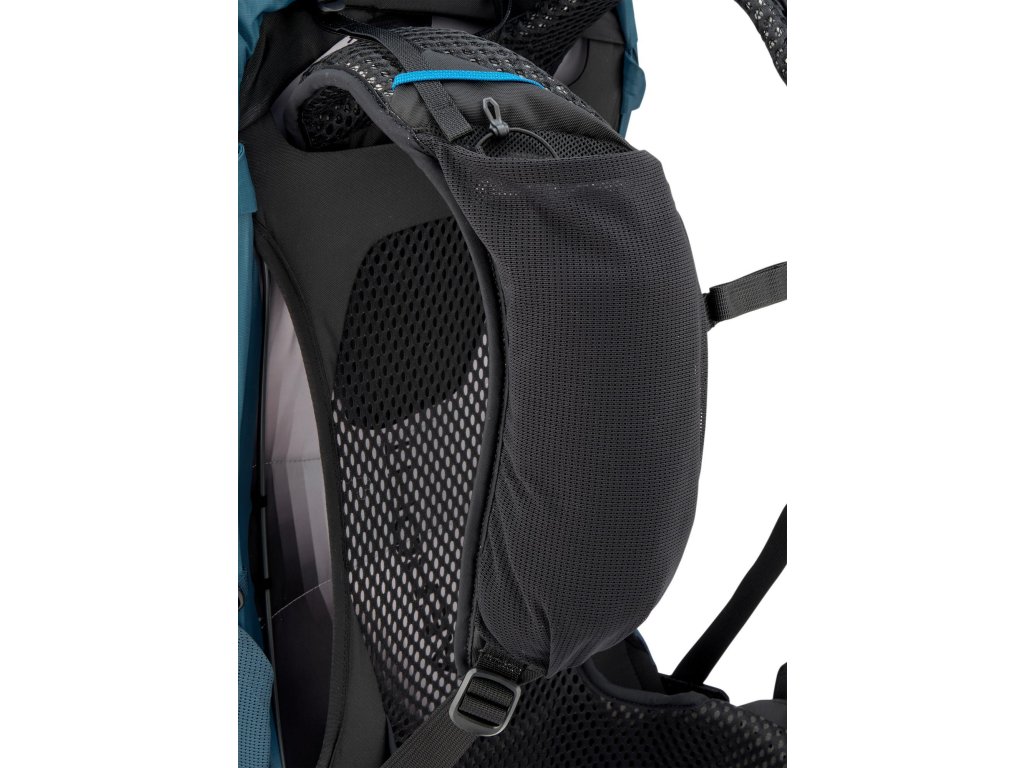 Do hlavní komory jdeš shora – vstup se stahovací šňůrkou a víkem, které má kapsu na zip. Když potřebuješ něco rychle vytáhnout z hlubších věcí, pomůže přední vstup na zip. Vepředu je strečová odkládací kapsa, po stranách 2 síťované kapsy na lahve. Trekové hole připneš do poutek a zajistíš gumou. Na ramenních popruzích máš úložné řešení pro softflask a drobnosti po ruce. Bederní pás s předním dotahem a kapsami na zip drží stabilitu a oporu při pohybu. Uvnitř je kapsa pro 3l hydrovak s vývodem na hadičku, po stranách horní i spodní kompresní popruhy. A když se počasí zlomí, vytáhneš integrovanou pláštěnku.