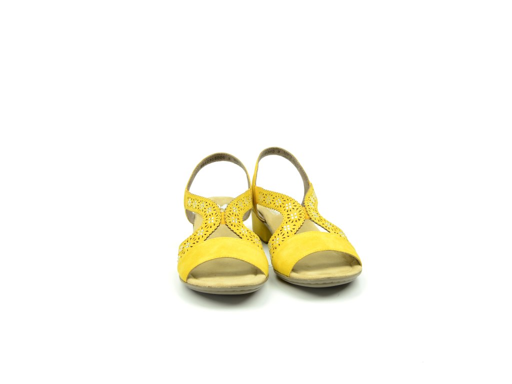 Dámské sandály žluté barvy mají pásky v oblasti nártu posázené kamínky a jsou zdobené perforací. Tyto pásky jsou uprostřed spojeny pružnou gumičkou, která je použita i ve spojení s páskem kolem paty. Nízký podpatek a pevná podešev jsou zde pro Vaše pohodlí na každém kroku. Tento model unosíte jak do práce, tak třeba na procházku či koupaliště s dětmi. Technologie:Antistress – podešev je díky této technologii lehká, flexibilní, absorbuje nárazy při došlapu a snadno se přizpůsobí každé noze.